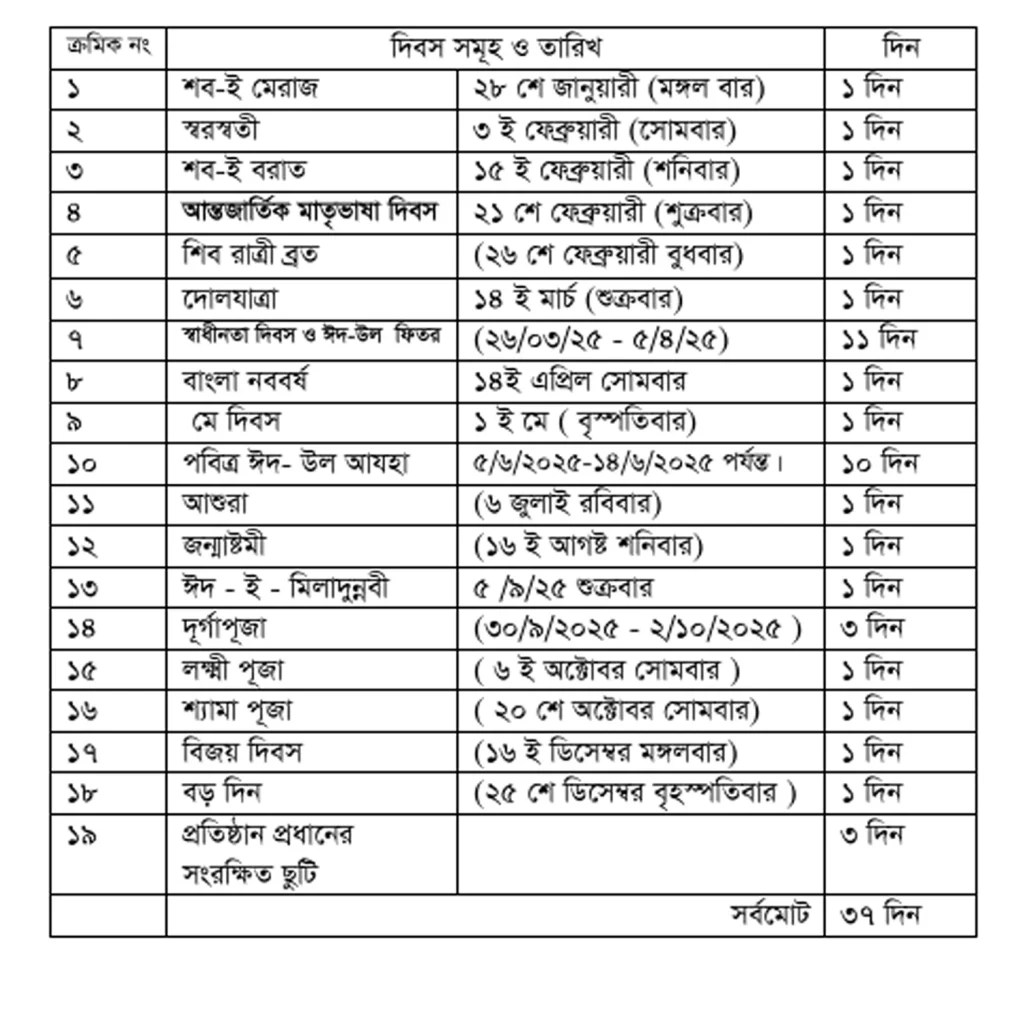 ৩. ঈদ উল ফিতর ২৬/৩/২০২৫ থেকে ৫/৪/২০২৫ (১১ দিন)।